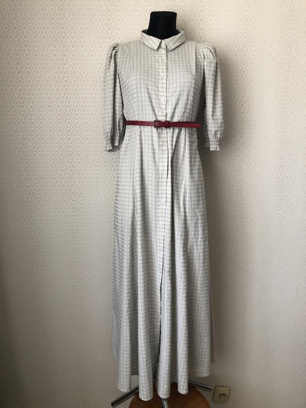 Длинное платье рубашка в мелкую клетку. Цвет светло-серый со светло-бежевым подтоном (на последних фото вообще кажется, что оно больше бежевое, чем серое)). Ткань мягкая, приятная к телу. В составе 3/4 хлопок, 1/4 п/э. Отрезное по линии талии. Рубашечный воротник. Застёгивается по всей длине на 11 деликатных пуговичек. Рукав 3/4, фонарик ,по краю широкая резинка. В боковых швах карманы. Без подкладки. На плечах защипы (не уверена, что они были изначально, возможно, их сделала прежняя хозяйка)) - показала на фото 8. Хорошо смотрится с поясом (фото 1), пояс в комплект не входит. К сожалению, флажка с размером не нашла, предполагаю, что это М, но в любом случае прошу ориентироваться по замерам! Показала посадку на манекенах двух размеров S и L (параметры манекенов в объявлении ниже), считаю что в обоих случаях выглядит достойно ! ) Замеры изделия в не растянутом виде, см: плечи 34, подмышки (примерно равно ПОГ) 50, ПОТ 45, ПОБ (Замер делаю на расстоянии 65 см от плечевого шва, если вещь короче, то по краю изделия) 70, длина до шва на талии 37, длина 137, длина рукава 40. Объёмы черного манекена, см : плечи 39, ОГ 87, ОТ 73 ОБ 90 Объёмы желтого манекена, см : плечи 40, ОГ 97, ОТ 77, ОБ 100 Отправляю Новой почтой либо наложенным платежом (при условии оплаты доставки в оба конца), либо по предоплате на карту Приват, Укрпочтой по предоплате, Meest по предоплате Продаю много фирменных вещей Airfield, Strenesse, Gerry Weber, Steilmann, Brax, Bonita, Basler, Frank Walder, Apanage, Olsen, Ulla Popken, Gardeur, Monari, Rabe, Guess, Hauber, Marks&Spencer, Concept K. Много новых вещей (с этикеткой) - можно на подарок. Смотрите другие мои объявления. Спасибо, что заглянули :-)