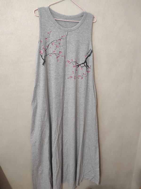 платье трикотажное длинное, состояние нового, цвет меланж серый, ткань как футболка но плотнее, нежный принт сакура, по бокам карманы, на размер стандартный 46М, можно полномерный 46М, замеры: длина 135см, плечи 36-37см, под рукавами 43см, в талии и до самого низа широк, ткань тянется, ткань натуральный хлопок приятный на ощупь,
