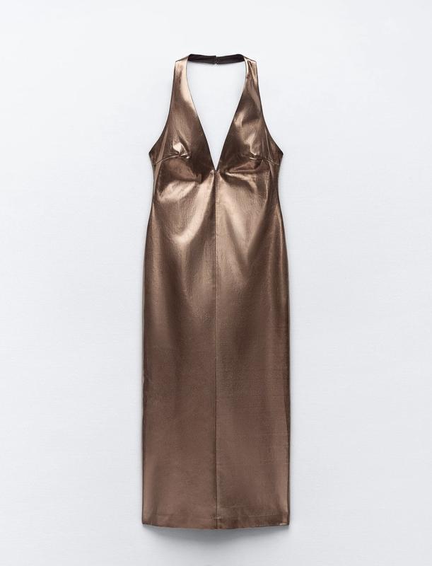 Новое платье Размер с-м Платье миди с завязками на шее и глубоким V-образным вырезом. Ткань имитация металла. Разрез на задней кромке. Внутренняя подкладка контрастного цвета. пуговицы на шее. Потайная молния в заднем шве.