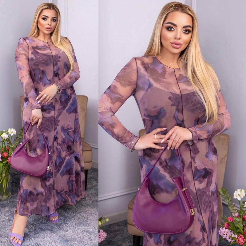 Код. 164 💰💰 Ціна. 1380грн Сукня з сітки стрейч розширена від талії донизу (у комплекті чорна сорочка на бретельках з віскози ). Сезон: весна-літо Розміри: 42-46, 48-52, 54-58 Тканина дуже еластична, добре тягнеться. ▫️чотири кольори: - Малина - сіро-бежевий - блакитний - рожевий