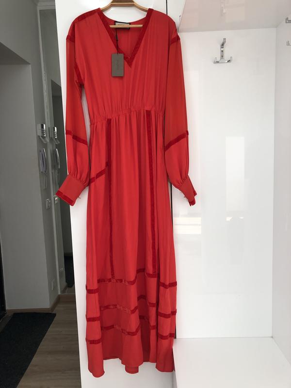 Красно коралловое платье, с велюровыми полосками, рукав на пол прозрачный, шифоновый