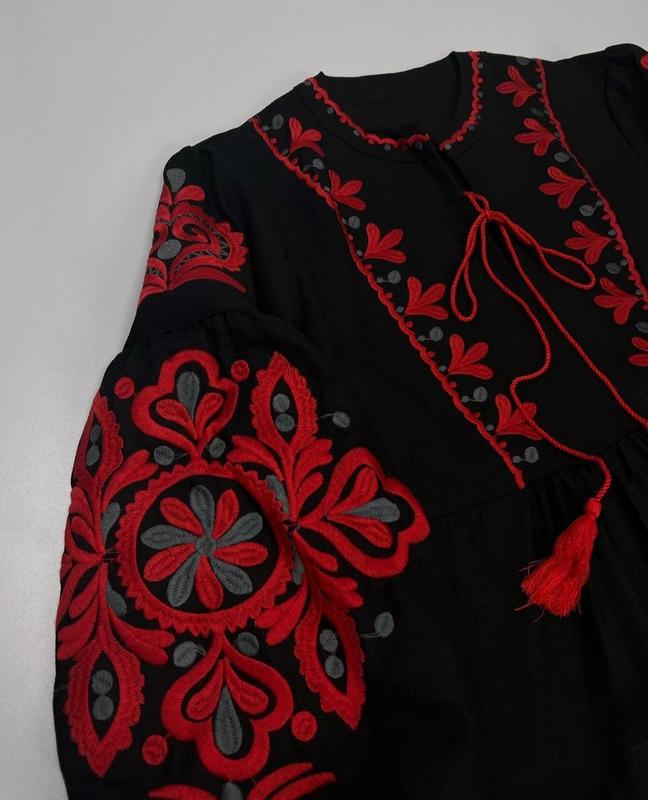 Довга сукня з вишивкою у етнічному стилі. Чорно-червона вишиванка жіноча має дві довгі зав'язки, які затягують комірець і об'ємні вишиті рукава. Розмір єдиний-універсальний. Сукня вишиванка має два кольори вишивки рукавів: червоно-сірий та біло-червоний. Плаття застібається на блискавку, яка вшита збоку. Колір: чорний/темно синій Матеріал: бавовна Розмір: One size. Довжина 120 см, обхват грудей 86-89 см, довжина рукава 53 см, обхват талії 82-84 см, в стегнах йде вільно.