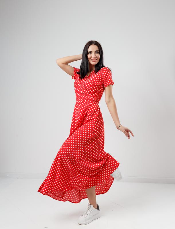 Літня сукня в підлогу "Кайлі" Кольори: червоний (горошок), чорний (горошок), фрезовий (горошок), блакитний (горошок) Розміри: 42, 44, 46, 48 Матеріал: софт Виміри: Довжина по спинці: 135-138 см Довжина рукава: 17-18 см Плаття літнє у підлогу – безпрограшний варіант, як виглядати жіночно і стильно в жарку погоду. Воно прекрасно підкреслює вигини фігури і приховує її недоліки. Завдяки якісному матеріалу не парить, дарує відчуття легкості. Модель з довжиною максі має глибокий V-подібний виріз на запах, короткий рукав і розкльошені нижню частину. Фіксується на талії поясочком. Виріб представлено в декількох варіантах кольорів і прикрашена принтом у вигляді дрібного горошку. Важливо! Відтінок тканини і розмір гороху може відрізнятися (залежно від постачання тканин). Браком не вважається. Наявність уточнюйте. Відправка за повною / частковою передоплатою на картку кожен день окрім неділі. Безпечної оплати немає.