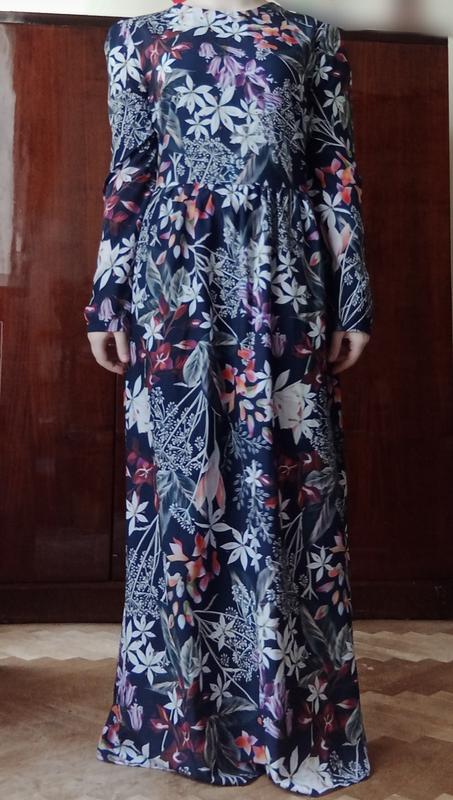 Синее платье с цветами, платье в идеальном состоянии, одевали 1-2 раза, без дефектов и пятен. Размер: Полу обхват талии 43 см. Рукав от шва до шва 63 см. Длина (по спине) 143.