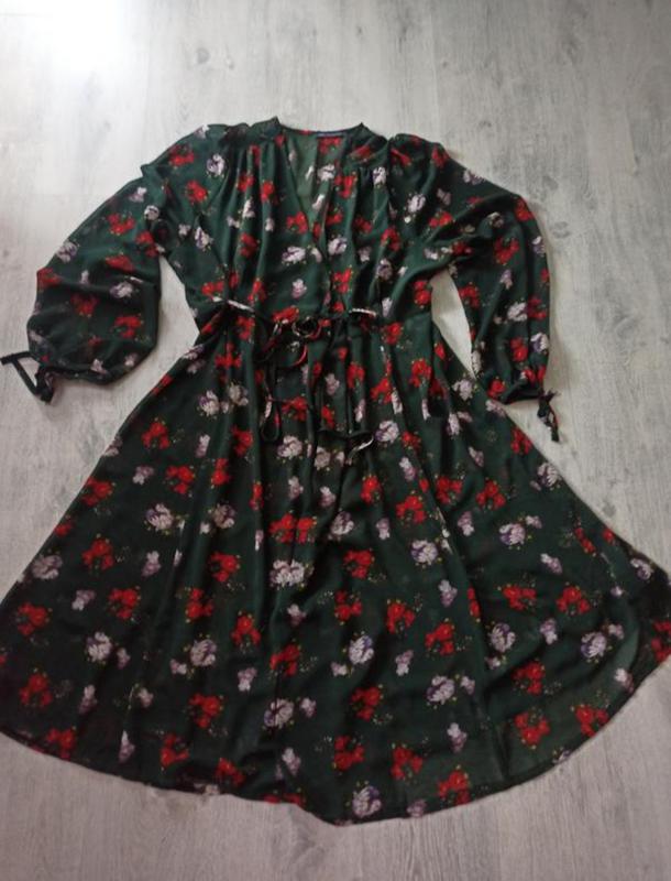 Фірмова сукня халат в стані нової. Тканина шифонова, фактурна, просвічує. Завязується на зав'язки, тонкий пояс пришитий, протягується через середину і можна зав'язати спереду або позаду. На шиї є дві маленькі кнопки які по бажанню можна застібнути. Рукав об'ємний і також завязується на зав'язки. Розмір іде оверсайз, але краще підійде на 52-56. Довжина 125