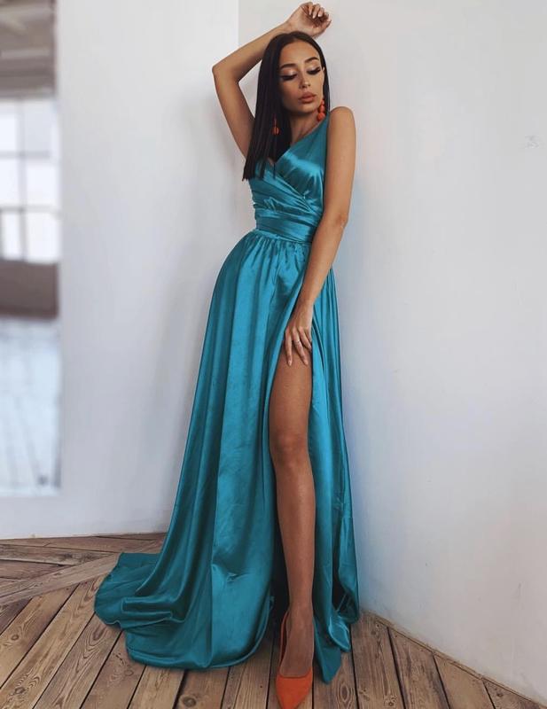 Шикарна сукня на запах💚 Насыщенный глубокий цвет морской волны (напиток оттенок выглядит как на 1 и 4 фото) Материал: Сатин-Котон. Размер подойдет на XS-M, так как ширину запаха можно регулировать. Грудь до 92 см, талия до 74 см. Длина платья от плеча 138 см.