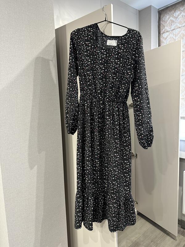 Платье в цветочный принт с длинным рукавом и разрезом на ножке.