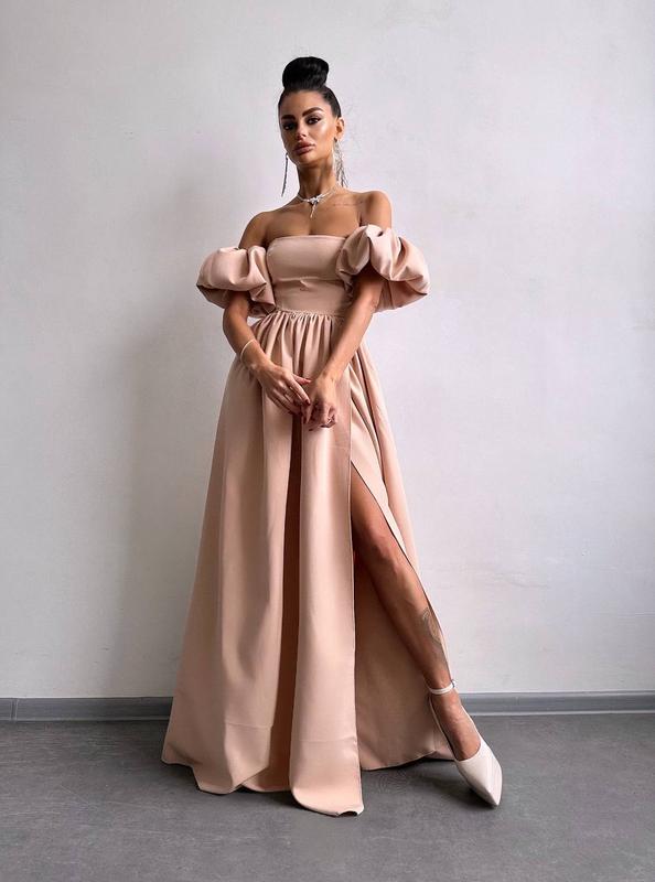 Платье макси с разрезом на юбке и объемными рукавами ▫️тканина: креп - костюмка ▫️размер: S и М( L + 300 грн) Шик
