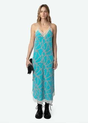Длинное шелковое платье Aqua для женского синего нижнего белья - Цепочка и фирменные узоры ZV и кружевные ленты - V-stell - Нерегулируемые тонкие ремни - Разрезы на дне Это французское кружево было сделано Софи Халлетт исключительно для Zadig&Voltaire.