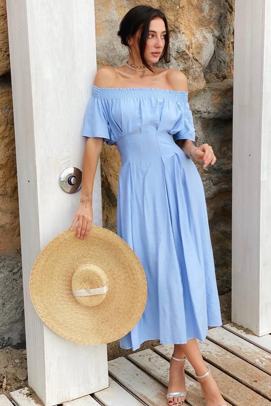 Легка літня сукня блакитного кольору Тканина жатий лен-штапель На резинці,тому дуже гарно сідає на будь-яку фігуру Колір як на фото Розмір s/m Загальна довжина 104 см
