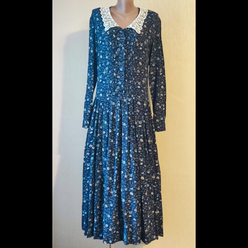 Винтажное чайное платье знаменитого бренда Laura Ashley из смесовых материалов. Изделие с длинными рукавами, отрезной удлиненной талией, присборенной юбкой, застежкой лифа на пуговичках обтянутых тканью, и двумя боковыми прорезными карманами. Нежный кружевной воротник - фирменный дизайн Лауры Эшли. Цветовая палитра - темно-синяя основа, украшенная мелкими английскими садовыми цветочками в голубых и бежевых оттенках. Рукава с манжетами на пуговичке. Пояс завязывается сзади. Две запасных пуговицы сохранились. Сочетание хлопка и шерсти делает это платье удобным и теплым в холодные месяцы. Винтаж 80-х. Оригинал. Размер: 12. ПОГ - 50 см. ПОТ - 48 см. Плечи - 45 см. Рукав - 64 см. Длина - 144 см. Материалы: 84% вискоза, 16% шерсть. Сделано в Великобритании