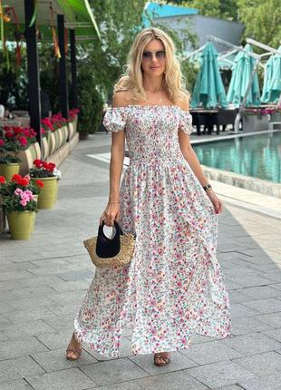 Эффектное и воздушное платье с оригинальным кроем — идеальный выбор для жарких летних дней. Открытые плечи, лиф на мягкой эластичной резинке и разрезы по юбке создают лёгкий, женственный и романтичный образ. Цветочный принт подчёркивает нежность и утончённость, а натуральная ткань дарит комфорт в любую погоду. Ткань: 100% вискоза (штапель) Размер: универсальный (подходит на 42–50 укр.) Платье отлично подойдёт как для прогулок, так и для летних мероприятий. Настоящее воплощение лёгкости и женственности!