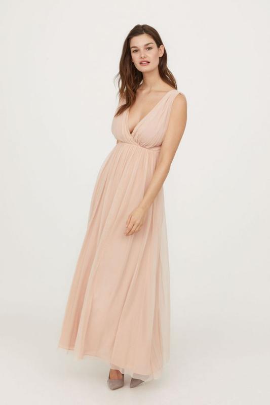 Длинное вечернее, свадебное, выпускное платье H&M. Топ с запахом, V-образный вырез декольте, бретели с силиконовым краем, отрезная линия талии. Потайная молния и крючки на спине. На подкладке. Размер в наличии 38. По отрезной линии 35.5 см Длина 142 см Ткань в три слоя - мягкий фатин, шифон и подкладочная ткань. Новая, без бумажной бирки.