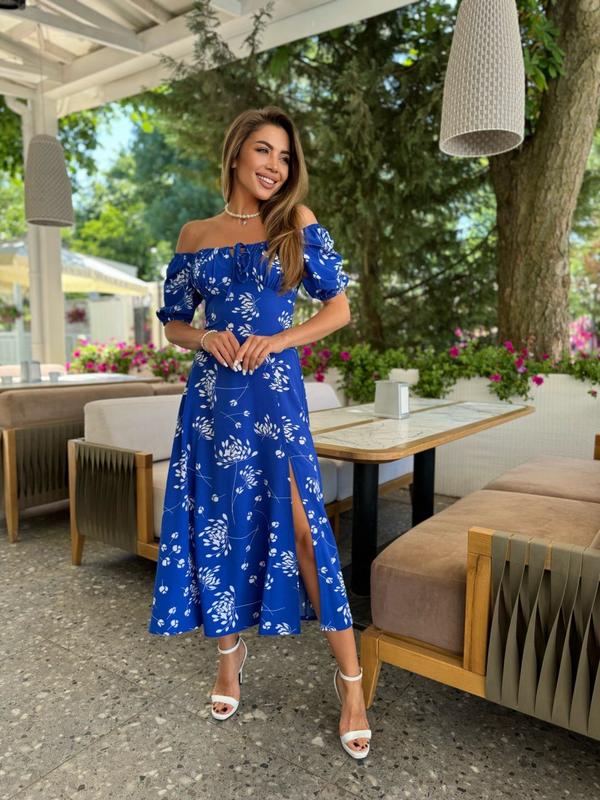 СУКНЯ 💙🩷🤍💚 Арт. 5/3_9А0041/8 Ткань: евро-софт Цвет: зеленый, белый, малина, электрик Размеры: S, M, L, ХЛ, 2ХЛ Описание: Нежное и легкое платье с разрезом на ноге. Длина модели миди с открытыми плечами и фонарики рукавами. ( замеры указаны на параметры)