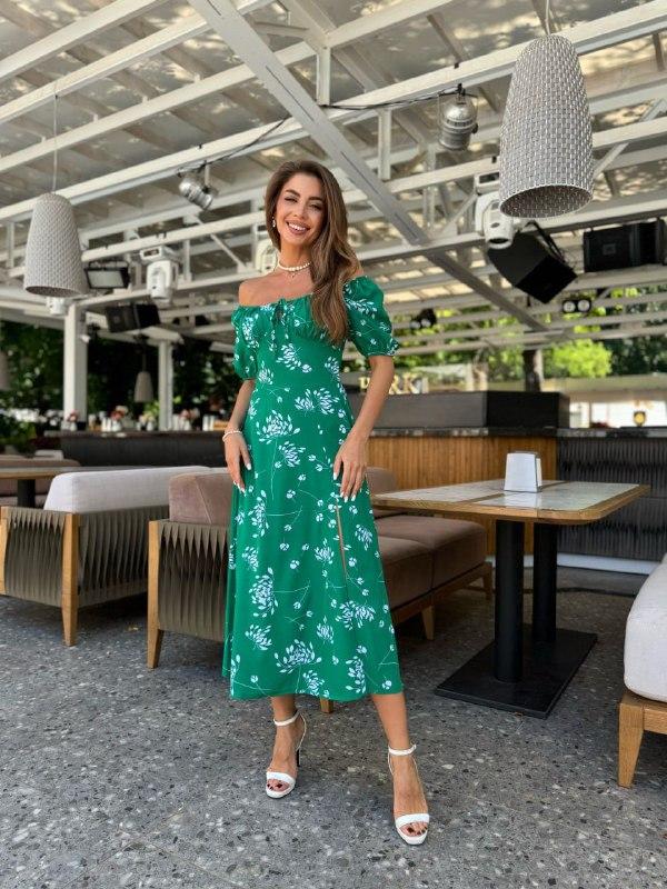 СУКНЯ 💙🩷🤍💚 Арт. 5/39А_0041/8 Ткань: евро-софт Цвет: зеленый, белый, малина, электрик Размеры: S, M, L, ХЛ, 2ХЛ . Описание: Нежное и легкое платье с разрезом на ноге. Длина модели миди с открытыми плечами и фонарики рукавами. ( замеры указаны на параметры)