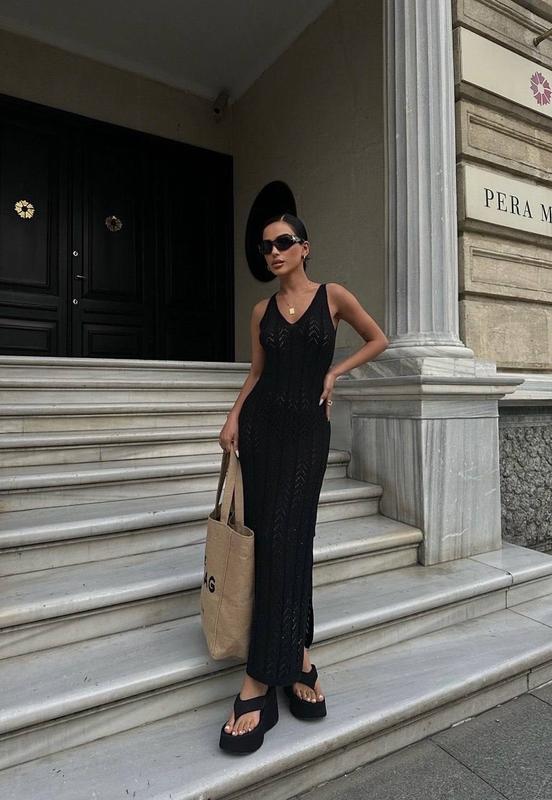 Актуальные ажурные платья сбоку с разрезами Размер единый 42/44 Черный и молочный Полуобхват грудь 33 - 43 см Длина 140 см Состав : 100% cotton