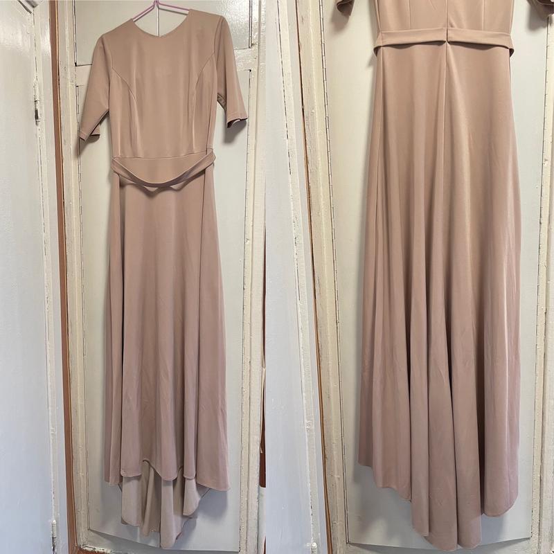 Сукня довга зі шлейфом. Була подругою нареченої. Тканина дуже хороша, дорога. Пошиття з тканиною декілька років тому обійшлось біля 3000. Тканина добре тягнеться. Заміри: По грудях: 100-110 По таліі: 85-95 По бедрах: вільно Довжина спереду: 150 Довжина ззаду: 180