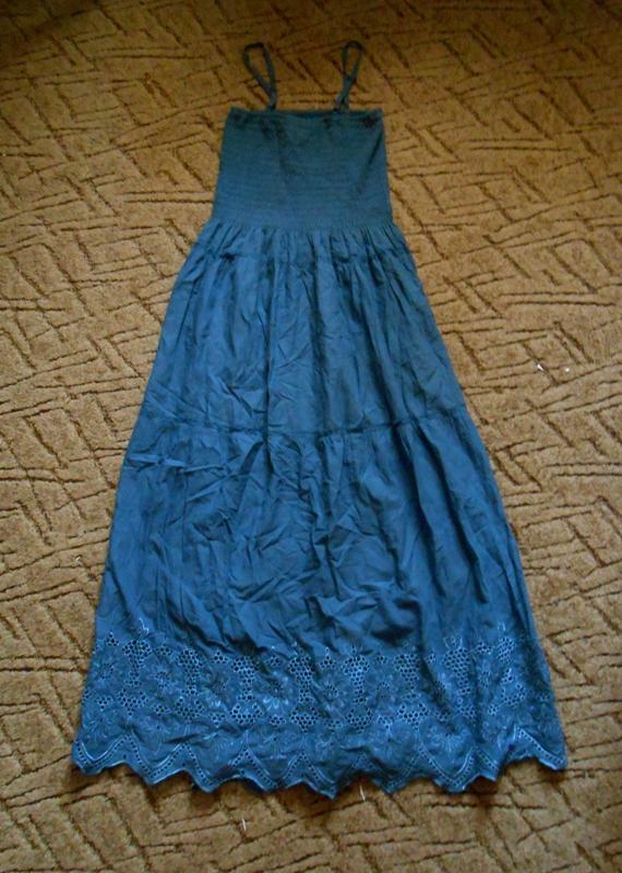 Платье-сарафан в пол, на подкладке. Красивый глубокий цвет. В очень хорошем состоянии. верх на резинке (очень тугая) 32 см - в спокойном состоянии, тянется до 53см, Длина 120 см (без бретелей- регулируются) Размер 12-14