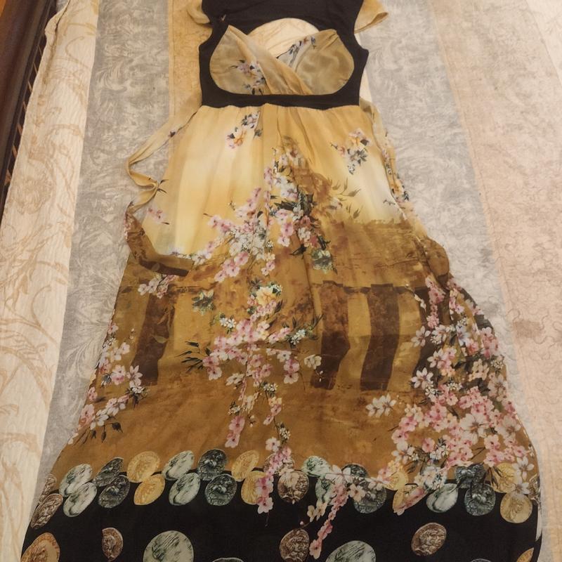 Длина по спинке 140 см. На рост до 165 см только с каблуком. Завышенная талия (под комку) - полуобхват по черной вставке 34 см (в нерастянутом виде). Верхняя часть микромасло, основной нежный натуральный шифона. Нижняя юбка короткая, трикотаж. Идеально на наш 46. Подойдет и на 44, свободнее. Хорошо ложится на объемную грудь, благодаря драпировке визуально увеличивает. При необходимости можно "защелкать", уменьшить.