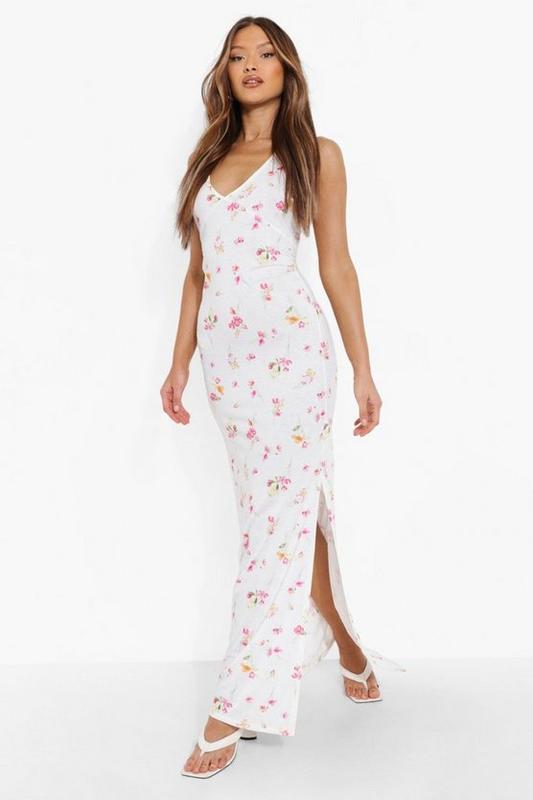 Длинное платье с глубоким вырезом снизу и цветочным принтом boohoo