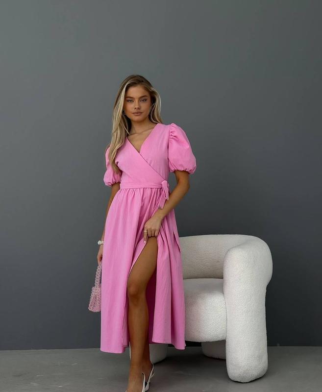 Сукня Мод 373 Размеры : 42-44, 46-48 Тканина : льон Цвет: молоко, черный, розовый, голубой Нежное и женственное платье на запах!