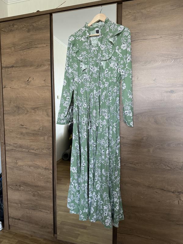 Легкое длинное платье в размере Л С цветочным принтом С горящий рукав на манжете и пуговице; воротник стойка с завязками; юбка плиссе