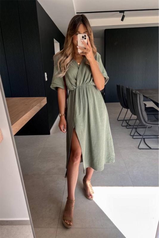 В НАЯВНОСТІ👌🏼 🔴🔴🟠 🔴🟠🟠🔴🔴🟠 Сукня 🔹Мод: so 076 🔹Розмір: 42-46 🔹Кольори: рожевий, олива, беж 🔹Тканина: муслін Максимальні параметри: Ог: до 94 см От: до 80 см Об: до 105 см Довжина 112 см.