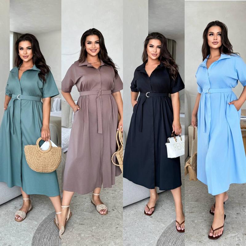Платье из легкого коттона, на пуговицах, рубашечный воротник. Короткий цельнокроеный рукав, талия на резинке, с карманами Тканина: котон стрейч Цвет: черный, мокко, мятный, голубой Размер: 48-50, 52-54, 56-58