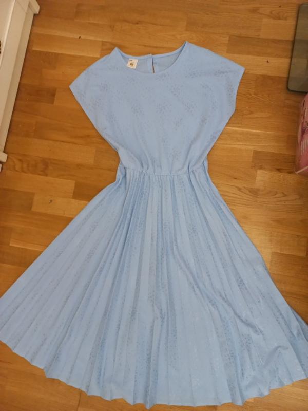 Дуже красива вінтажна сукня небесного кольору,спідниця пліссе.Розміо 38-42.Талія на гумці,приспущене плече.Довж.123 ( 48, 75)