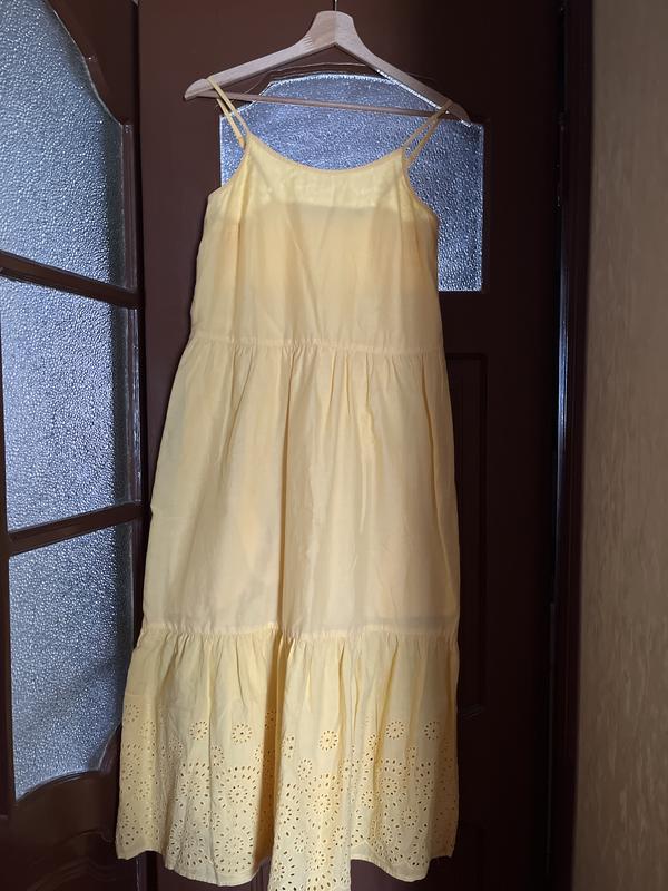 Летний сарафан приятного желтого цвета с подкладкой с красивым узором внизу. Брительки регулюються . Размер XS ( объем груди 84, длина юбки от кокетки 78 см )