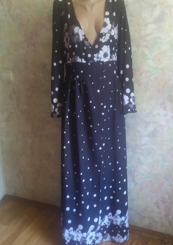 Красивое длинное платье в отличном состоянии. Платье на запах, застегивается на три пуговицы( одного нет), и изнутри подстегивается на заклепку. Тканина, легка, не тягнеться. Длина -145см, пог-52см+, пот-40см, на спинке резиночка, поб-свободно, плечи-38сы, рукав от плеча -60см. Отправка после оплаты на карту