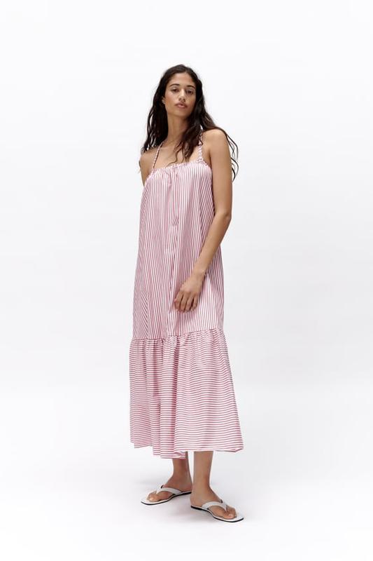 Нове з бірочками сукню від зара є в наявності в розмірі м напівобхват по грудях 42 см, тягнеться до 51 напівобхват таліі напівобхват бедер-вільно довжина 134 см склад: 100% бавовна На всі питання з задоволенням відповім)