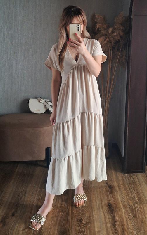 Стильное платье свободного кроя. В области груди V вырез. Короткий рукавчик. Не просвечивается. За счет свободного кроя подойдет для беременных. Размер S/M На фото на мне на S, рост 159 см ПОГ - 51 см ПОТ - 67 см ПОБ - 100 см Длина - 120 см Состав: 95% полиэстер, 5% эластан