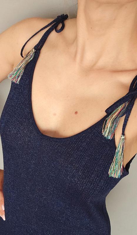 Очень красивое платье Mango с люрексом. Подойдет и как вечерняя, и на каждый день с балетками. Размер указан S, но подойдет и на М, так как тянется. Без броек, но совершенно новая, ни разу так и не надела. Длина 117, но можно регулировать связками.