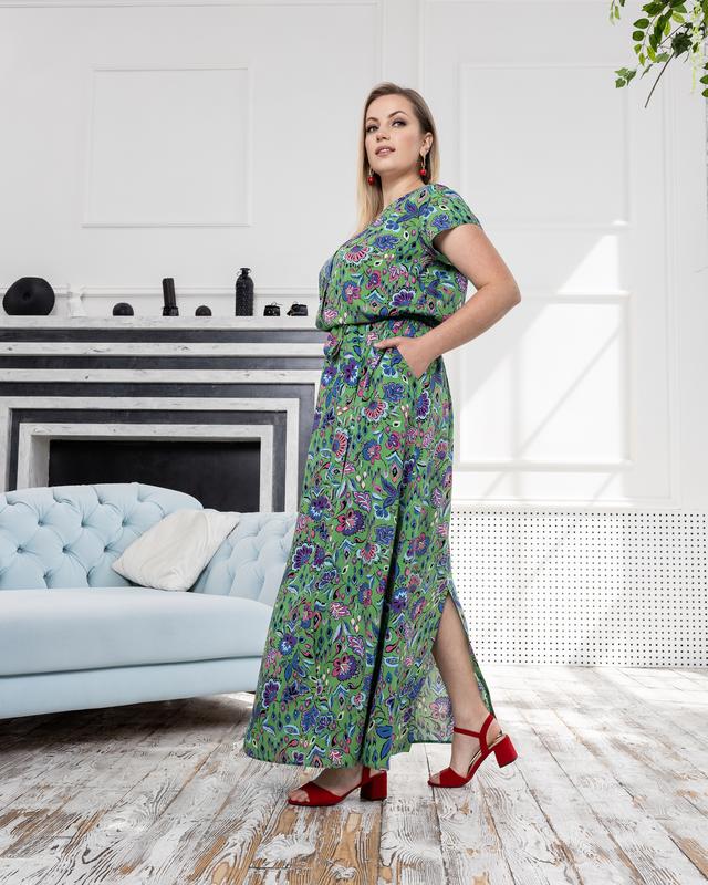 Розміри 50, 52, 54, 56, 58, 60 Тканина — штапель. Сукня вільного силуету, відрізна по талії з поясом на гумці. Довжина максі. Спідниця напівсонце. Рукав арковий. Горловина кругла на планці-обтачці. Спинка з декоративним вирізом. Ліф сукні з напуском.