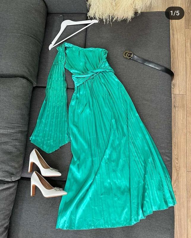 💚Потрясающее платье-плиссе на одно плечо в сочном цвете морской волны ты будешь выглядеть на все 100% S Пог 43/45 см Пояс 33 см (резинка) Поб свободного кроя Длина 142 см