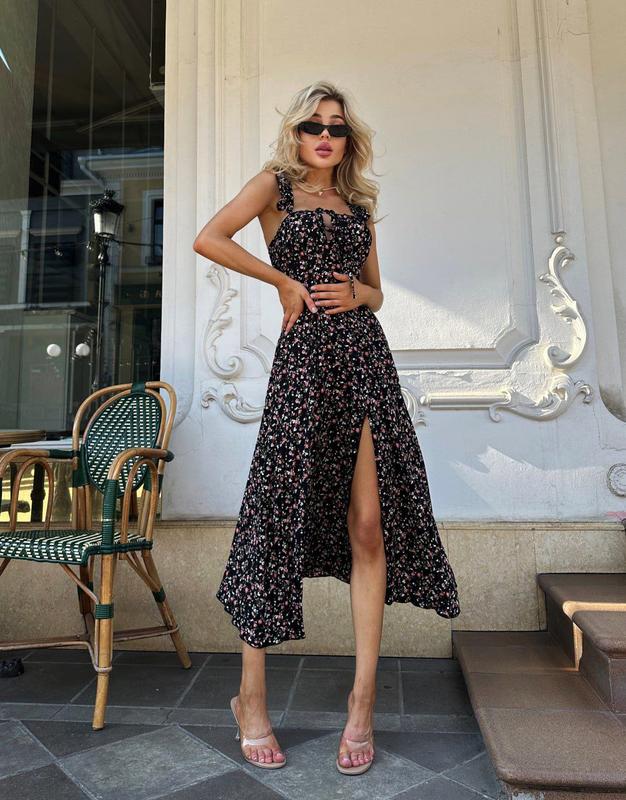 Тканина: штапель Размеры: 42-44, 46-48 Цвета: черный принт, белый принт Легкое очень женственное платье из натуральной ткани. Только взгляните на эту красивую спинку... Можно носить со спущенными регулируемыми бретелями.