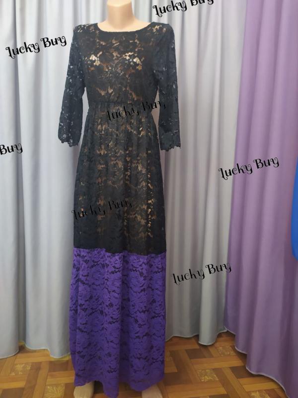Код 574707 574707 Гипюровое длинное полупрозрачное пляжное платье Гипюровое пляжное длинное платье с рукавами 3/4. Застегивается на спине, на пуговицу. По талии резинка. Цвет черный+фиолетовый. Размер универсал К платью прилагается подклад в виде комбинации, бежевого цвета(на фото) Произведено в Италии На залишку 2 шт Заміри: Сукня* Плечі-35 см Пог-37 см Пот-32 см По стегон-64 см Рукав-44 см Довжина-140 см Комбінація* Пог-45 см Пот-47 см По стегон-49 см Довжина-89 см На залишку 2 шт 400 грн