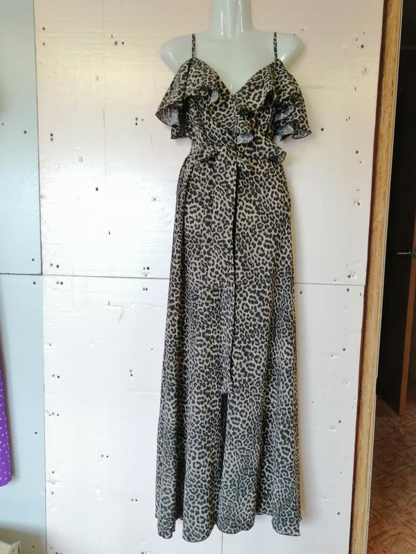 шикарна довга сукня З легкої струминної тканини суперсофт Принт горох і леопард ефект запаху відкриті плечі волани та рюші шикарная длинное платье С лёгкой струящейся ткани суперсофт Принт горох и леопард эффект запаха открытые плечи воланы и рюши