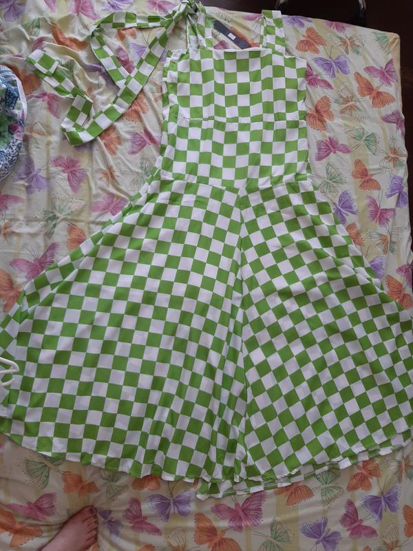 Платье новое, размер по Бирочно 12 на наш Л (можно на М или на ХЛ, зависит от ваших настроек) можете просмотреть сетку стандартную. Ткань очень легкая. цвет салатово-белый квадрат, как на фото. Спереди разрез на ножке.В комплекте поясок, на фото завязан на брителтке