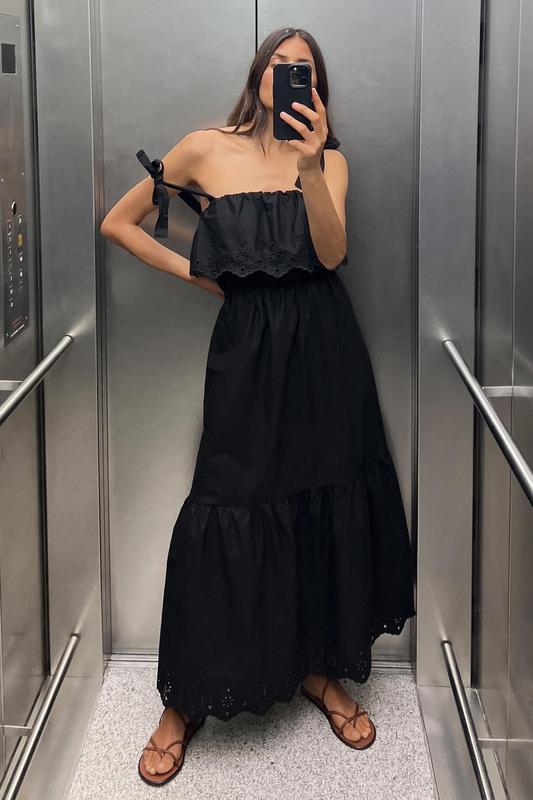 Цена 2420 грн Выполнена из 100% хлопка! Платье с прямым вырезом на резинке с откидной деталью. Широкие лямки на завязках. Эластичный пояс. Вышивка резьбой. Черный <unk> 3564/151