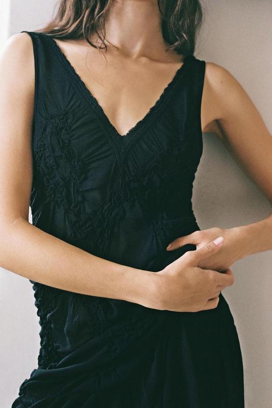 Цена 3500 Полупрозрачное платье с V-образным вырезом, кружевной отделкой в тон и широкими лямками. Деталь из фактурной ткани. Асимметричный подол. Черный <unk> 7521/817