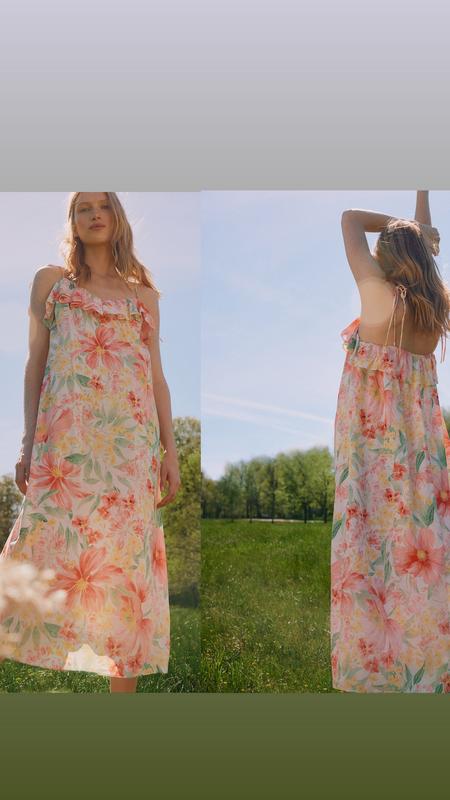 Цена 1580 грн Платье миди с бантовыми бретелями и V-образным вырезом с широкими воланами. Модель свободного кроя с тонкой резинкой на спине. Без подкладки. Артикул: 1234153002 HM