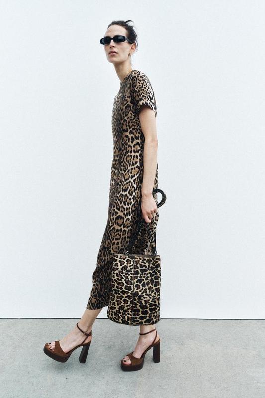 Цена 2420 ZARA WOMAN COLLECTION Платье миди из 100% пряденой вискозы. Круглый вырез и короткие рукава. Боковой разрез на подоле. Невидимая застежка-молния сзади. Леопард | 8252/163