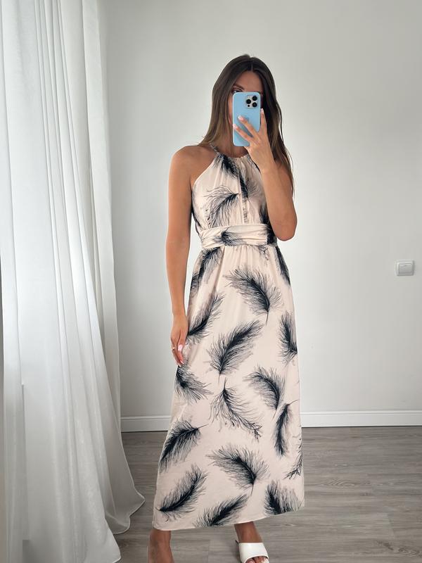 Легкое красивое, удобное платье в пол, имеет красивый принт пирин Размер с(м) Ог 51 см, вот 34-40 см (завязывается под фигуру) об 56 см, длина 137 см