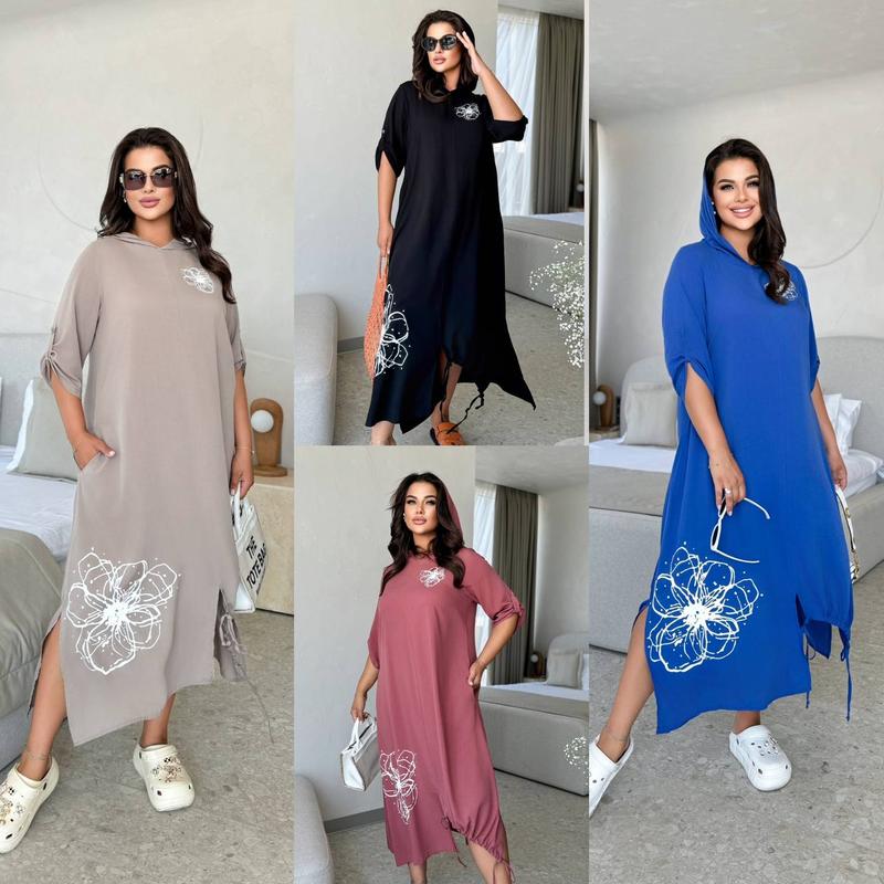 Платье арт. ha2. 2887 Тканина: штапель Цвет: черный, синий, фрезовый, бежевый Размер: 48-50, 52-54, 56-58 Платье свободного кроя, с накатом, капюшоном, с карманами. Рукав с патиком и рабочей пуговицей. Асиметричний низ на кулісці.