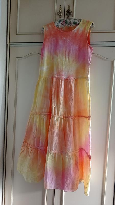 Нежное и радостное натуральное хлопковое платье. Очень удобная и одновременно красивая. Длинная, в пол. Стан - новая без бирки. Отсутствие света погладить, единственный недостаток) Размер - М, но красиво садится и на S. Сверху трикотаж, мягкий и нежный типа футболка, снизу тоненькая хлопковая юбочка.
