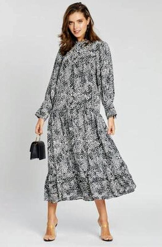 Классное, стильное, качественное платье,крой свободный ярусами,рукав длинный свободный с широким манжетом, короб невысокая стойка, сзади застегивается на две пуговицы, ткань качественная вискоза, состояние новой вещи, пог-54,пот-54, поб-56, длина -127, длина рукава -59.