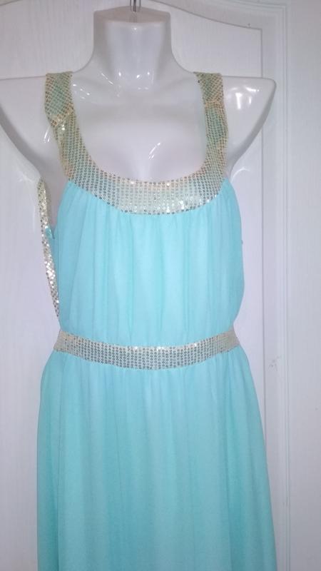 длинное платье в пол, бирюзового цвета. Небольшой разрез сбоку. Очень красивая открытая спинка.