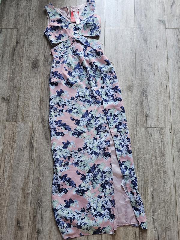 желчное платье с разрезом и вырезами на талии.